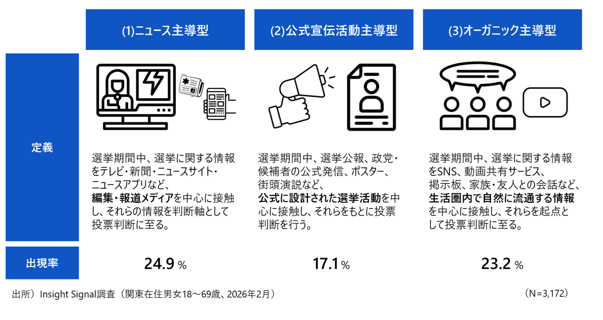 図表1に示すとおり、投票者を情報接触の起点(接触の中心となった情報源)別に分類すると、ニュース主導型(24.9%)、公式宣伝活動主導型(17.1%)、オーガニック主導型(23.2%)の3タイプに加え、いずれにも明確に分類されない層(「その他」)が約35%を占めている。