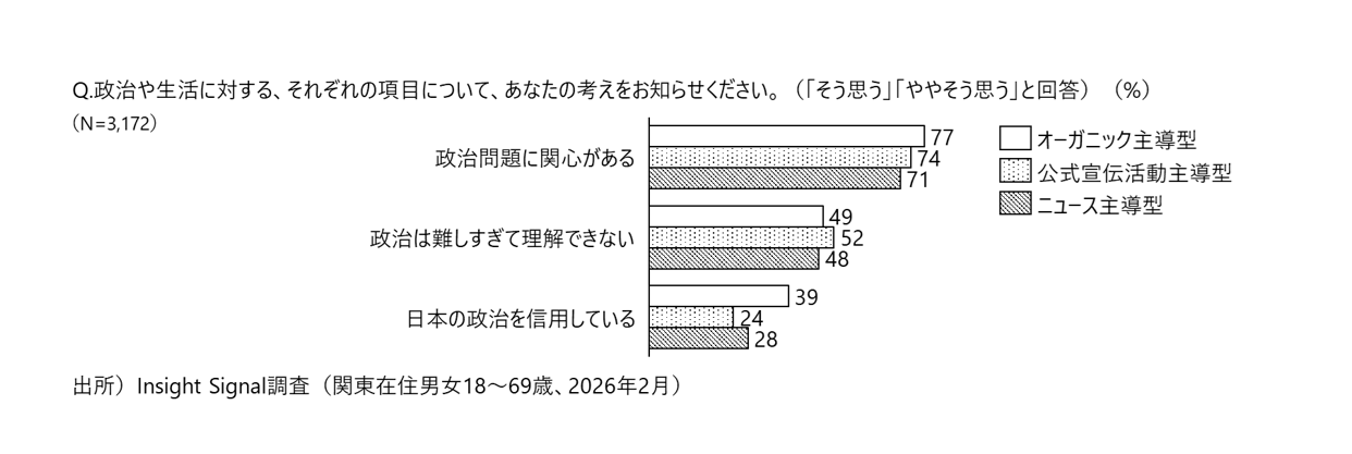図表2を見ると、公式宣伝活動を起点として投票判断に至った有権者は、政治への関心が必ずしも低い層ではない(政治問題に関心がある:74%)。一方で、「政治は難しすぎて理解できない」と感じている割合は52%と、オーガニック主導層(49%)やニュース主導層(48%)と比べて最も高く、情報を自力で探索・整理することに対する負荷を感じやすい層である。