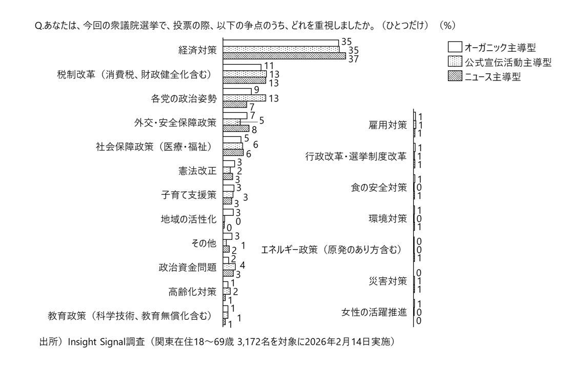 むしろ注目すべきなのは、理解しづらさを理由に政治から距離を置くのではなく、SNSや動画などを通じて自ら情報に触れ、判断しようとする姿勢が、オーガニック主導層で相対的に強く見られる点である。そのため、この層では政党や経済政策、税制改革といった大きなトピックを比較するよりも、自身の生活実感や不安と結びつく争点(例えば地域活性化、子育て支援、憲法改正といったテーマ)に強く反応する傾向が見られた(図表3)。短時間で「自分ごと化」できる切り口や、感情的な理解につながる表現が、投票という意思決定の入口として機能している可能性が高い。