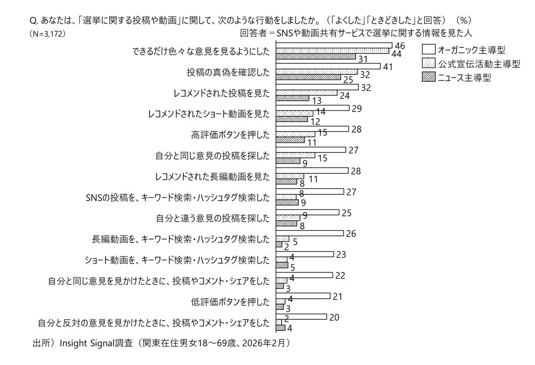 図表4でSNS・動画共有サービス上での行動を見ると、オーガニック主導層は受動的に情報を流し見ているわけではない。「できるだけ色々な意見を見るようにした(46%)」「投稿の真偽を確認した(41%)」など、探索・検証行動の割合は他の類型より高い。レコメンド動画の視聴やキーワード検索、評価ボタンの操作など、関与度の高い行動も複数見られる点は注目に値する。