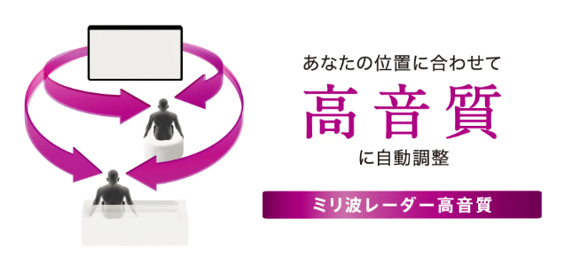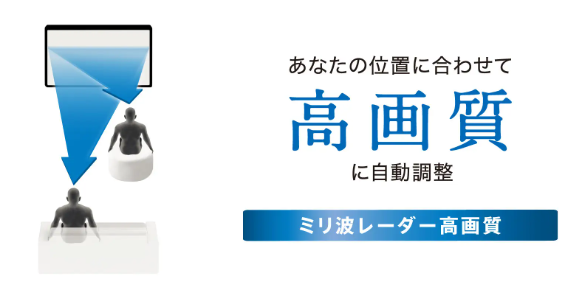レグザの新モデルには、視聴者の位置に応じて画質や音質を最適化し、より快適な視聴体験を実現する機能として、ミリ波レーダーを活用した「レグザセンシング」が搭載されています。本機能は、テレビの前にいる人の人数や位置を把握し、日々の視聴体験の向上に活用されています。