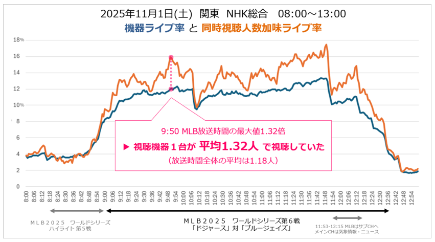 2025年11月1日 関東 NHK総合で放送された「MLB 2025 ワールドシリーズ第6戦」の分析では、試合開始のAM9時頃から終了のPM12時過ぎまで、「共視聴」による顕著なリフトが確認されました。