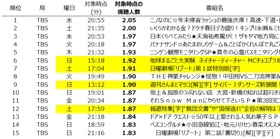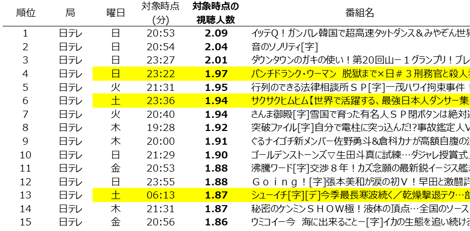 G帯人気番組に加え、土日23時台のドラマ・バラエティ、土曜朝6時台の「シューイチ」がランクイン。