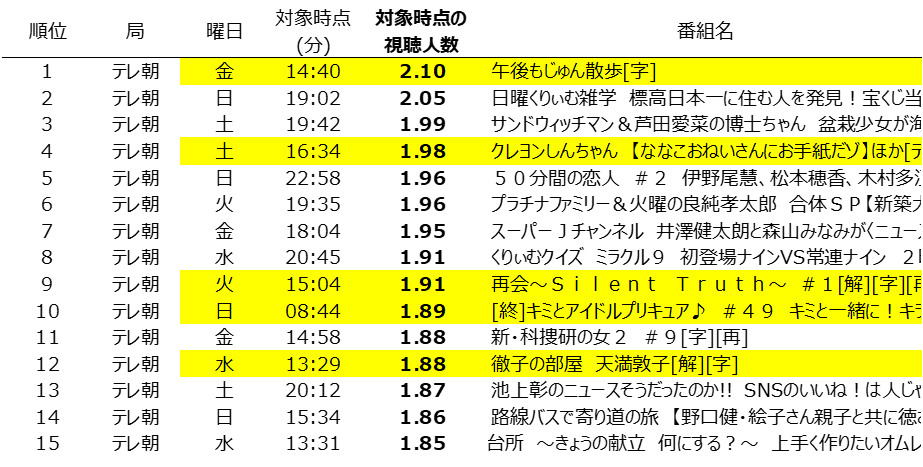 平日日中の番組がランクインしている点が他局に比べて特徴的。「じゅん散歩」「再会」「徹子の部屋」。また、子供番組は親子/兄妹の共視聴があることを改めて認識できる。
