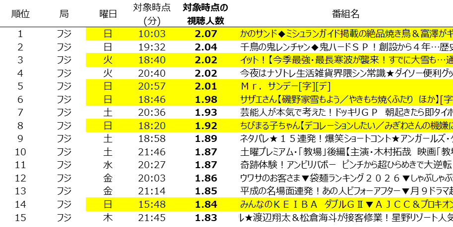 日曜午前・午後、平日ニュース、長寿アニメと、バラエティに富んだ番組がランクイン。「かのサンド」「みんなのKEIBA」「イット!」「サザエさん」「ちびまる子ちゃん」。