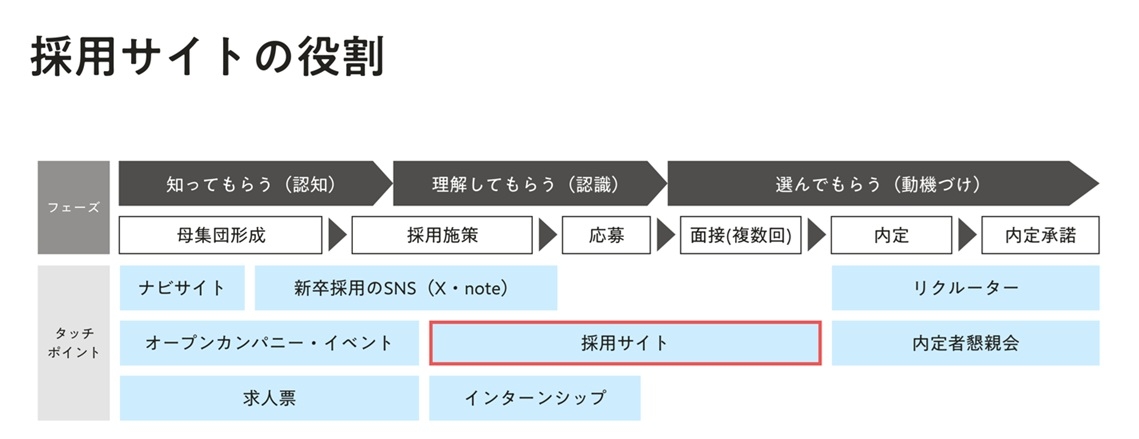 就活生に企業を知ってもらい、興味を持ったその先で理解を深め、サイトを見て「自分に合っていそうだ」と志望度を高めてもらうための媒体として位置づけています。最終的には、数ある選択肢の中から選んでもらい、その意思決定を後押しする役割を担います。