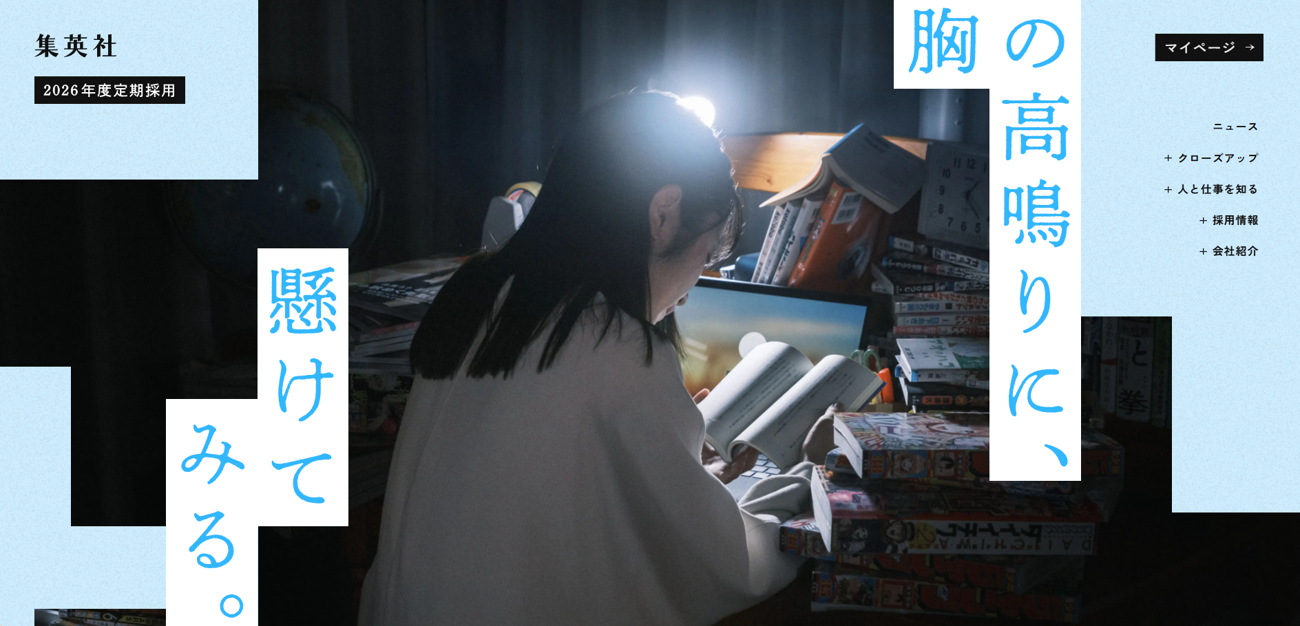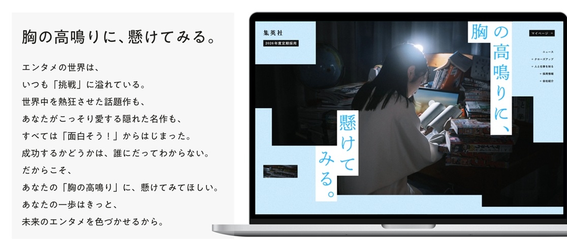 この考え方は、出版の世界にも通じるものだと捉えています。一人ひとりの「面白そう」という純粋な気持ちからヒット作品が生まれ、ときに時代を動かしてきました。そうした価値観を、採用サイトのコンセプトにも重ねて表現しています。