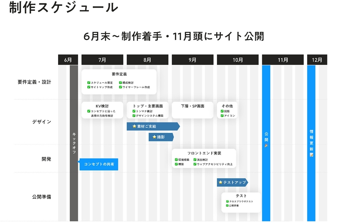 6月末頃、全体のキックオフがあり、この年の採用コンセプトが集英社から共有されました。7月から8月中旬にかけて要件定義、設計のフェーズで、スケジュール、サイトマップ、構成を考えました。並行してデザインもトンマナやキービジュアルの検討を進めました。デザインで主要な画面が出来上がってきた9月頃からフロントエンドの実装も走り、演出を詰め、テストアップ・テストし、11月初頭のサイト公開に進めました。