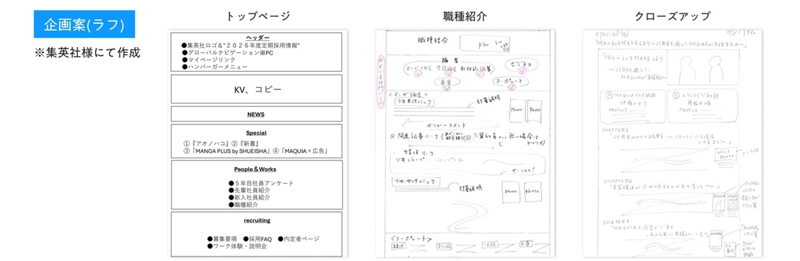 こうして策定されたサイトマップをもとに、各ページのイメージや構成案も集英社側で用意されました。中には手書きのラフスケッチも含まれており、具体的な表現イメージを共有しながら設計が進められました。