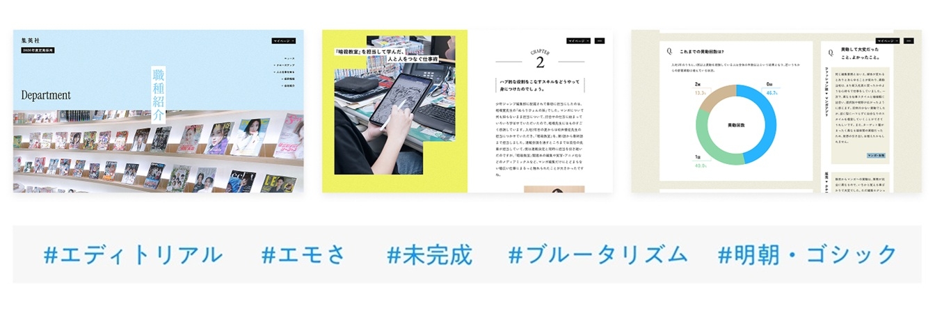 ページ構成やコンテンツ内容の検討は、基本的に集英社が主導しました。採用情報にとどまらず、読み物としての魅力を持つ記事コンテンツや、社内アンケートの結果をグラフや図版で可視化したコンテンツなど、全体として十分なボリュームと多様性を備えた構成となっています。