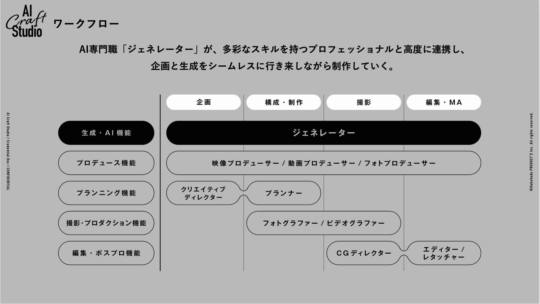 ジェネレーターとは、単にAIを操るオペレーターを指す言葉ではありません。彼らは、ビデオグラファー、ディレクター、プランナー、レタッチャーといった、従来の制作現場で磨き上げられた「確かな腕」を持つクリエイターたちのことを言います。