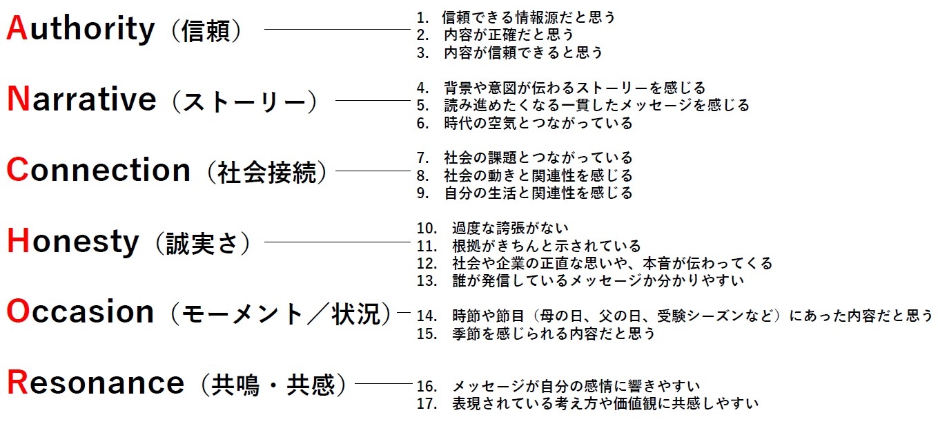 私たちは新聞の価値を「ANCHORメディア」と位置づけました。アンカー(錨)になぞらえ、Authority(信頼)、Narrative(理解)、Connection(社会との接続)、Honesty(誠実さ)、Occasion(接触の文脈)、Resonance(共鳴)という6つの価値を定義しています。新聞は、ブランドと生活者・社会を「意味」でつなぎ、定着させる“錨”のような存在である——その仮説のもと調査を実施しました。