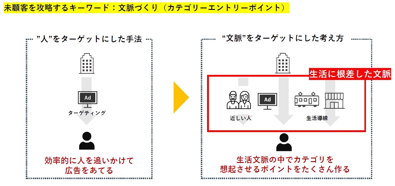 ・カテゴリーエントリーポイント(CEP)という考え方を提唱。ジレンマを乗り越えるためには、「人」ではなく「文脈」にターゲティングすることが重要である。